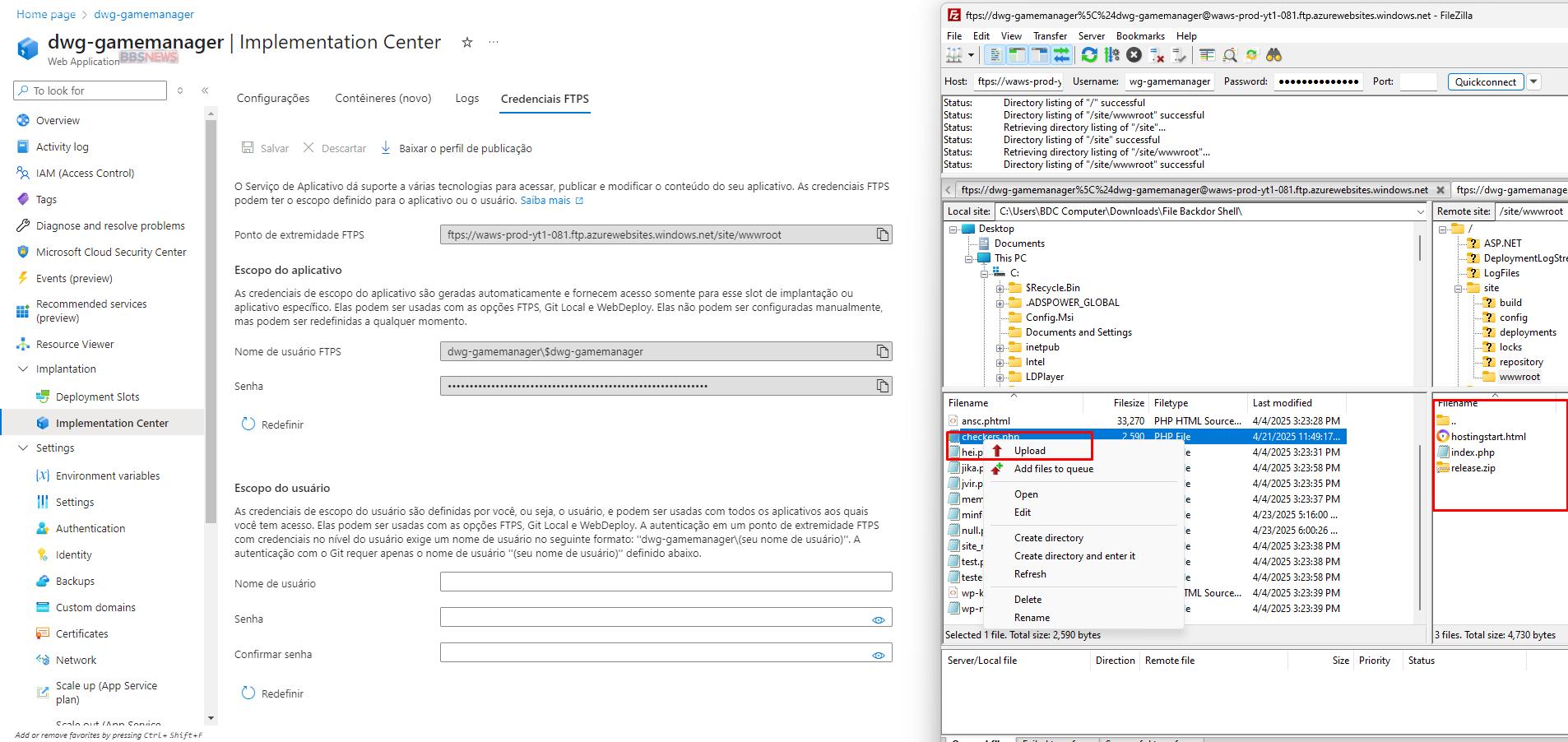 bagian kotak yang di sebelah kanan tersebut itu ada file bawaan dari azure, kemudian di sebelah kiri adalah file backdor shell yang mau di upload di file zila, kalian lalu “klik kanan” untuk upload file, abis itu selesai kalian cek dan done.